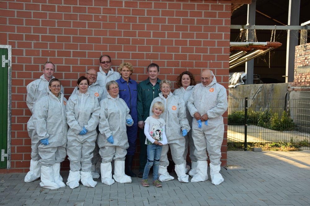 In Overalls gehüllt – um keine Keime und Krankheitserreger in den Stall einzuschleppen – ging es dann gemeinsam mit Ehefrau Jutta Niehues und Christian Röwert, Vorsitzender des Landwirtschaftlichen Ortsverband Neuenkirchen, in den neuen Maststall mit 1200 Mastplätzen. Diesen hat er vor zwei Jahren in Betrieb genommen. Zu seinem Hof gehören weiterhin 90 ha Ackerbau, ein weiterer Maststall und die erste Windkraftanlage in Neuenkirchen.