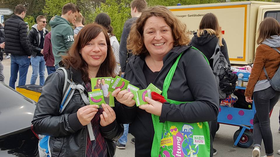Die Sprecherinnen Vera Nienkötter und Kathrin Horre hatten am 1. Mai tatkräftige Unterstützung bei der Aktion am Ofllumer See. Wie jedes Jahr sammeln sich hier ab morgens 10 Uhr die Jugendlichen und Jungerwachsenen mit ihren liebevoll gebauten Maiwagen, die neben sattem Musiksound auch Grill und Getränkebar beherbegen. Traditionell geht es dann über die alte Bahntrasse vom Offlumer See Neuenkirchen auf zu den Aawiesen in Wettringen. Zu Kondomen und Traubenzucker gab es den Kurzflyer der Grünen Jugend zum Programm der Landtagswahl am 14. Mai.