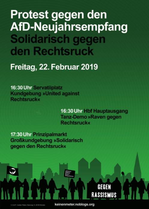 Auch wir fahren nach Münster und unterstützen den friedlichen und kunterbunten Protest des Bündnisses "Keinen Meter den Nazis in Münster". Abfahrt ist um 16:18 Uhr ab Bahnhof Rheine. Treffpunkt ist um 15:45 Uhr vor dem Haupteingang des Bahnhofes. Wer mitfahren möchte, kann das mit Gruppentickets, die von uns finanziert werden. Zur besseren Planbarkeit bitte eine kurze Mail an horrekathrin(a)gmail.com. Danke.