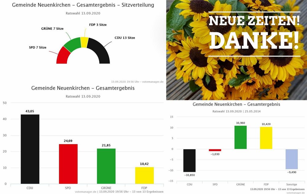 Leider hat es für unsere Kathrin nicht für die Stichwahl gereicht. Und dabei hat sie einen so ambitionierten Wahlkampf hingelegt. Schade! Aber eins der wichtigsten Ziele ist uns dann doch gelungen: Wir haben die Mehrheit der CDU gebrochen und können nun die wirklich besten Ideen für Neuenkirchen und St. Arnold diskutieren und auf den Weg bringen - unabhängig von der Parteienfarbe! Die Wähler*innen haben auf Orts- und Kreisebene gezeigt, dass sie nicht mehr mit der Arbeit der CDU zufrieden sind! Zweistellige Verluste sind eine klare Ansage! Wir haben unseren Auftrag verstanden und nehmen ihn ernst. Danke für das Vertrauen!