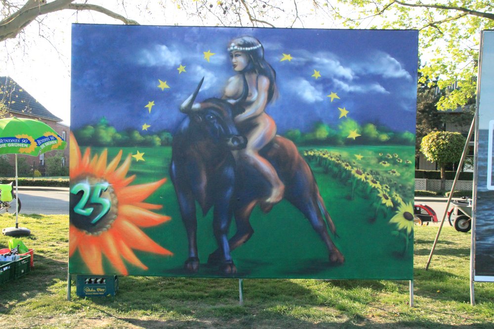 Der Ortsverband von BÜNDNIS 90/DIE GRÜNEN feiert in diesem Jahr sein 25jähriges Gründungsjubiläum. „Mit Blick auf die Europawahl im Mai haben wir uns gegen eine klassische Feier mit Schnittchen und Sekt entschieden“, erzählt Kathrin Horre, Sprecherin der GRÜNEN Neuenkirchen. „Europa ist eine tolle Idee, die wir noch besser machen wollen.“ So ziert das Großflächenplakat der GRÜNEN an der Rheiner Straße ein Graffiti-Kunstwerk von Europa auf dem Stier Zeus. In der griechischen Mytologie heißt es, dass Zeus sich in die Prinzessin Europa verliebte, sie in der Gestalt des Stieres nach Kreta entführte und sie dort heiratete. So habe der europäische Kontinent seinen Namen bekommen. Der Graffiti-Künstler Mario Kappel hat die GRÜNEN bei diesem Projekt unterstützt.