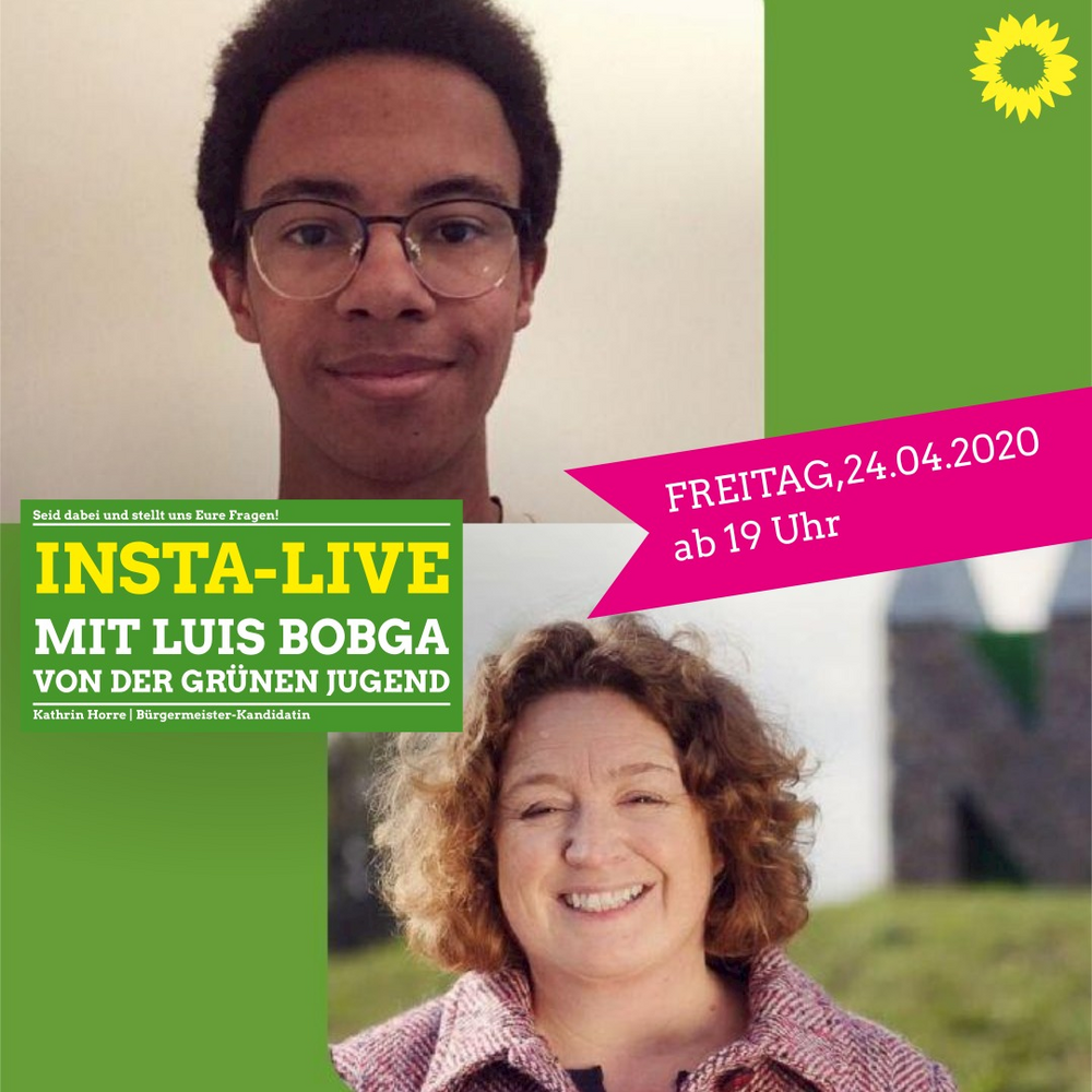 Am kommenden Freitag, 24.04.2020, findet abends um 19 Uhr das erste Insta-Live-Gespräch von unserer Bürgermeister-Kandidatin Kathrin Horre statt. Ihr Gesprächspartner ist Luis Bobga von der GRÜNEN Jugend im Kreis Steinfurt. Themen des Gesprächs werden u.a. der Schulstart der Abschlusschüler*innen und die Situation für Jugendliche unter den Corona-Kontaktbeschränkungen sein. "Aber besonders interessiert mich die Motivation junger Menschen, sich politisch zu engagieren", freut sich Kathrin Horre auf den Abend. "Was braucht es aus Sicht der Jugendlichen, dass echte Partizipation vor Ort gelingen kann?" Diese und weitere Fragen werden in dem Gespräch behandelt. Alle Interessierten können sich vorab per Mail mit ihren Fragen an info@kathrin-horre.de wenden. Oder im Live-Gespräch die Kommentarfunktion nutzen.