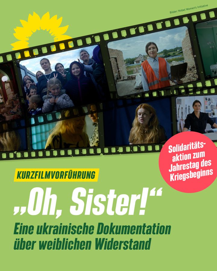 Am 24. Februar 2023 jährt sich der Beginn des Angriffskriegs auf die Ukraine. Die GRÜNEN Neuenkirchen laden zu einer Solidaritätsaktion ein: Ab 20 Uhr wird der Kurzfilm „Oh, Sister!“ im GRÜNEN Büro, Emsdettener Str. 13 in Neuenkirchen gezeigt. Anschließend gibt es Raum zum Austausch mit Rita Zimmermann, Osteuropahistorikerin, die sowohl in der Ukraine als auch in Russland gearbeitet sowie Familie und Freunde in beiden Ländern hat. Rita Zimmermann sitzt seit November 2020 für die GRÜNEN im Rat der Stadt Greven.