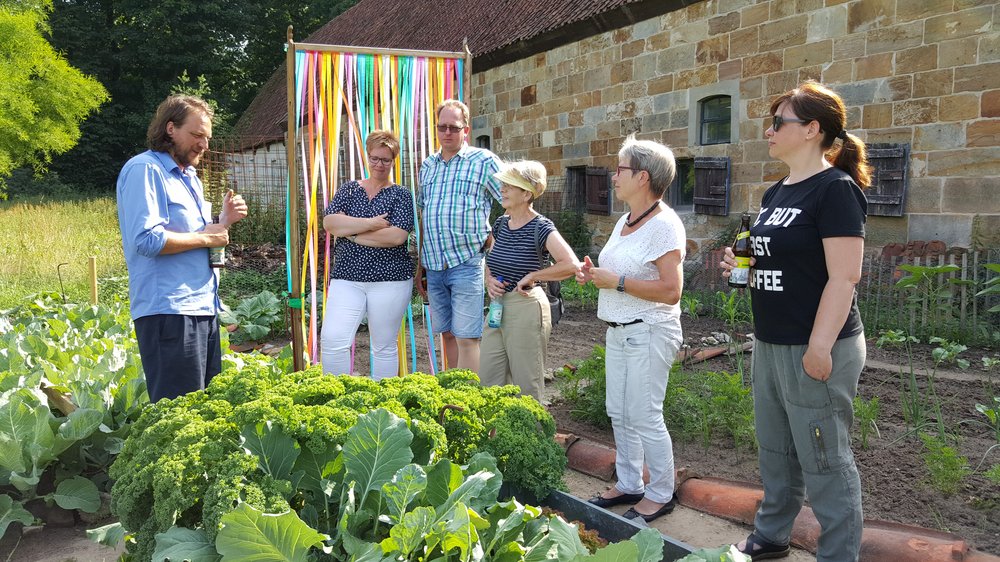 Kurz vor der Sommerpause machten sich die Mitglieder des Ortsverbandes von BÜNDNIS 90/DIE GRÜNEN auf eine ihrer beliebten Radtouren. Diesmal ging es zum Kloster Bentlage, Rheine. Dort ist ein Künstlerpaar aus Hamburg seit April mit ihrem Projekt PRESERVED//Survival Gardening 2017 aktiv. Swaantje Güntzel und Philip Scheibe kommen aus Hamburg und haben auf der Ökonomie des Klosters einen 100 m² großen Gemüsegarten angelegt. Sie experimentieren mit einer Saatgutmischung, die als Überlebensration für den Selbstanbau in Krisenzeiten angeboten wird. Philip Scheibe erklärte detailliert das Konzept der Künstler und den Ursprung der Idee zum Survival Gardening. Durchaus kritische Aspekte zur Globalisierung und der zunehmend verlorengehenden Kulturtechnik des Selbstversorger-Gartenbaus wurden diskutiert. Die Künstler nähern sich dem Thema Gartenbau bis Mitte Oktober auf sehr unterschiedliche Weise: neben der Pflege und Ernte des Gemüses sollen weitere Performences und Kochaktionen folgen, die dann in einer Ausstellung in der Scheune des Kloster Bentlage präsentiert werden. Ab Ende Juli kann man das Paar Güntzel und Scheibe im Garten antreffen. Sie freuen sich auf die vielen Gespräche der interessierten Besucher. Wer noch nicht dort war: Es lohnt sich!