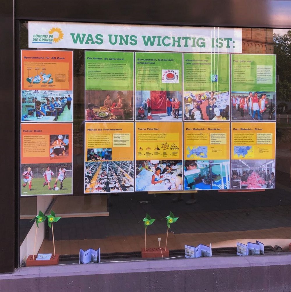 Im GRÜNEN Schaufenster in der Friedenstraße ist eine neue Ausstellung von Vamos e.V. Münster installiert worden. Titel: „Trikottausch – die zwei Seiten der internationalen Sportbekleidungsproduktion“. Inhaltlich geht es zum einen um die Vermarktung der Sportbekleidung und das Kaufverhalten, andererseits um die Arbeitsbedingungen der Näherinnen in den Weltmarktfabriken. So sind Kleidungsstücke oft bereits einmal um die halbe Welt gereist, bevor sie vom Endkonsumenten erworben werden. Damit sind die Produktionskosten so gering wie möglich. Überwiegend junge Frauen arbeiten in Asien als Näherinnen – mit geringer Entlohnung, ohne Arbeitsschutz und mit fast 90 Stunden in der Woche. Beim Anbau der Rohstoffe, dem Färben und Bedrucken der Stoffe, der Behandlung der Kleidungsstücke gegen Bakterien, Motten und Schimmel werden Tausende von chemischen Substanzen eingesetzt. Einige davon sind giftig, umweltschädlich und können Allergien auslösen.