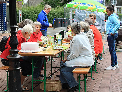 Das Wetter meinte es mal wieder nicht gut mit uns. Dennoch konnte nach leichtem Nieselregen um Punkt 10 Uhr das Open-Air-Frühstück mit allerlei bio, fair und Selbstgemachtem beginnen. Wir haben uns sehr über die netten Kontakte mit PassantInnen und WeggefährtInnen gefreut. "In Kontakt kommen" - das ist für uns das Wichtigste! Durch den Austausch von Ideen, Fragen, Sorgen und Bedürfnissen kann es uns gelingen, eine gute Arbeit für Neuenkirchen zu machen.