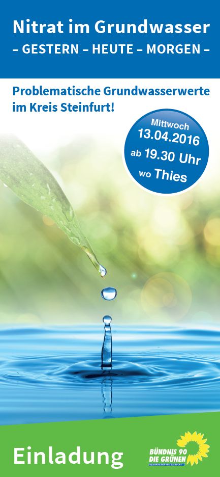 Am Mittwoch, 13. April 2016 um 19:30 Uhr, laden Bündnis 90/Die Grünen Neuenkirchen zu einer Diskussionsveranstaltung rund um das Thema Trinkwasserqualität in die Gaststätte Thies 42, Sutrum-Harum 9, ein. Unter dem Titel „Nitrat im Grundwasser“ sollen verschiedene Aspekte beleuchtet werden: Werner Wenker von der Unteren Wasserbehörde des Kreises Steinfurt wird in seinem Vortrag über den Zustand der Grund- und Fließgewässer im Kreis und Neuenkirchen berichten. Norwich Rüße, MdL und Sprecher für Naturschutz und Landwirtschaftspolitik der Landtagsfraktion Bündnis 90/Die Grünen, beschreibt anschließend die Herausforderungen für die Politik zum Thema Gewässerschutz. „Schon lange drängen wir Grünen auf die Werte der Wasserwerke Rheine und Ochtrup. Denn machen wir uns nichts vor: Neuenkirchen ist das Trinkwassergewinnungsgebiet für die umliegenenden Orte und die Werte aus den umliegenden Gebieten sind besorgniserregend!“, betont Ellen Pfennig, Fraktionssprecherin der Grünen im Gemeinderat.