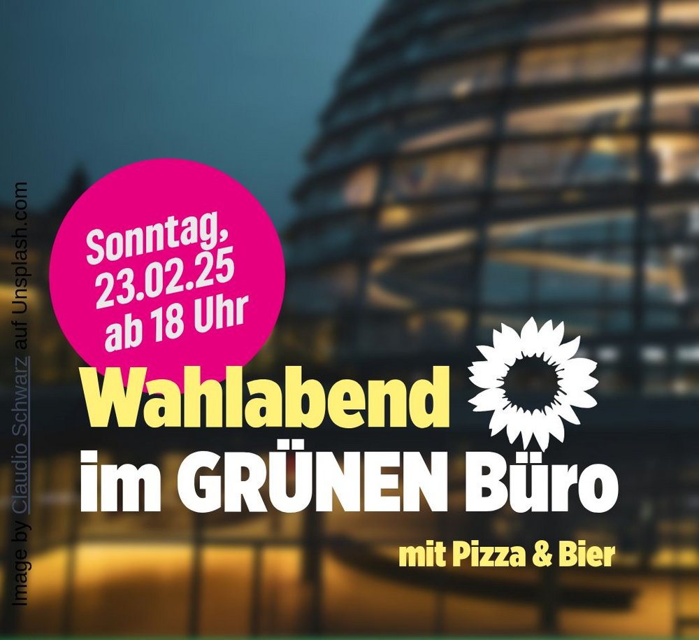 Wir laden alle interessierten Bürgerinnen und Bürger ein, am Wahlsonntag, 23.02.2025, ab 18 Uhr ins GRÜNE Büro, Emsdettener Str. 13 in Neuenkirchen zu kommen. Gemeinsam wollen wir die ersten Hochrechnungen und die Ergebnisse im Laufe des Wahlabends erwarten, diskutieren und analysieren. Das Feiern darf bei all dem ehrenamtlichen Engagement in diesem kurzen, kalten Winterwahlkampf nicht zu kurz kommen: Pizza und Getränke stehen für alle bereit. Wir freuen uns auf euch.