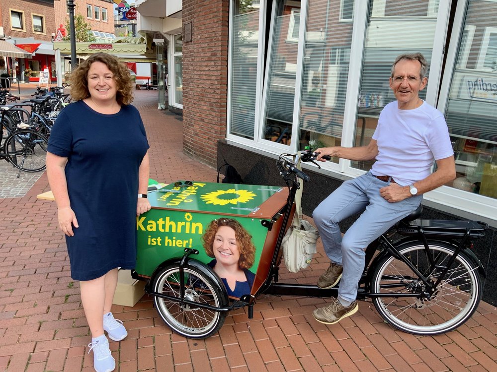 Kathrin Horre und die GRÜNEN Neuenkirchen hatten zu einem Open-Air-Gespräch mit Uli Ahlke, pensionierter Leiter des Amtes für Klimaschutz und Nachhaltigkeit im Kreis Steinfurt auf dem Wochenmarkt eingeladen. „Uli, du bist für mich ein Visionär. Schon früh hast Du Dich für die Energiewende im Kreis Steinfurt eingesetzt. Du bist der Gründer des Vereins 'Wie wollen wir leben e.V.', der in kreativer Weise Antworten auf diese zentrale gesellschaftliche Frage finden will“, so die GRÜNE Bürgermeister-Kandidatin. Einige interessierte Passanten hielten an der GRÜNEN Kuddel - wie das Wahlkampf-Lastenrad genannt wird - an und diskutierten eifrig mit. Über die Energie- und Mobilitätswende hin zu barrierefreier Quartiersentwicklung mit bezahlbarem Wohnraum und einer deutlichen Attraktivitätssteigerung des Ortszentrums wurden viele Ideen quergedacht. Sehr ambitioniert fand Uli Ahlke das langfristige Ziel der GRÜNEN, Neuenkirchen zur fahrradfreundlichsten Kommune im Kreis Steinfurt zu machen.
