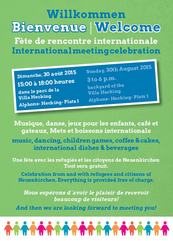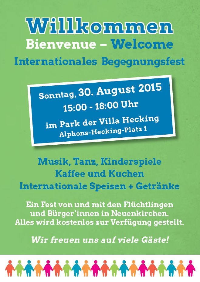 aus anderen EU-Ländern, die zum Teil schon jahrelang in Neuenkirchen wohnen und arbeiten – lädt die Gemeinde Neuenkirchen, in Zusammenarbeit mit den Ehrenamtlichen vom „Runden Tisch Flüchtlingsaufnahme und deren Versorgung und Integration“, am Sonntag, 30.08.2015 zu einem großen gemeinsamen Fest in den Park der Villa Hecking ein.